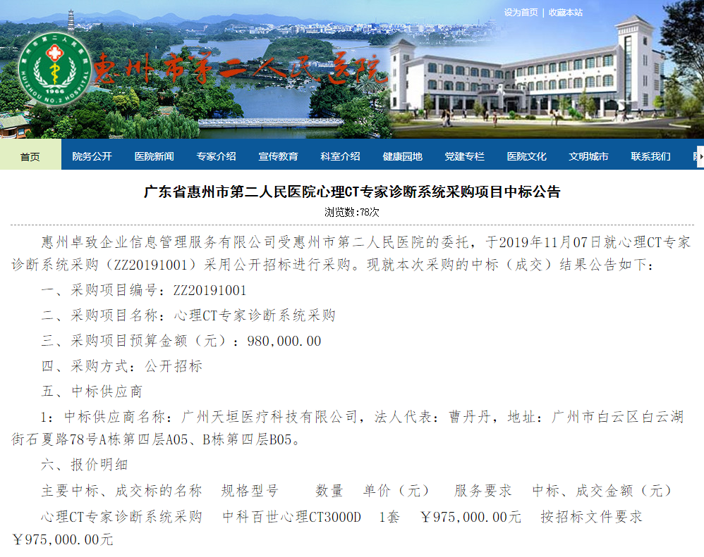 中标惠州二院98万心理CT(1拖6)